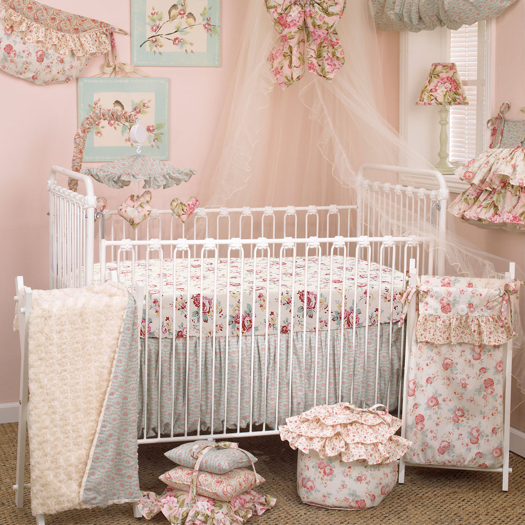 Tea Party 3 pc baby crib bedding collection by Cotton Tale Designs is a beautiful combination of soft vintage florals and rose faux fur.